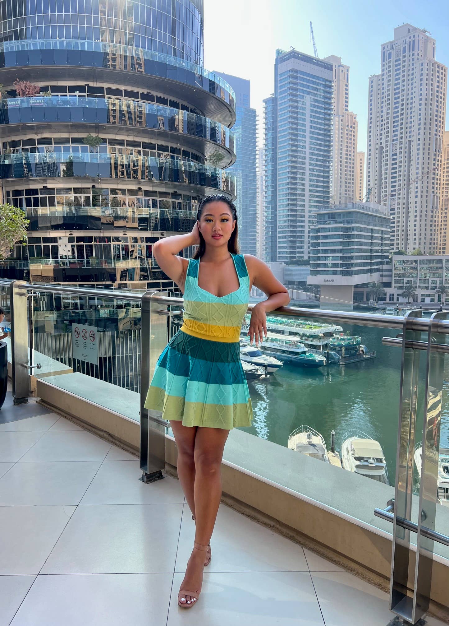 Bring color, confidence, and curve appeal with this Colorblock Knit Mini Dress — the ultimate statement piece for sun-soaked days and rooftop nights. Featuring a vibrant mix of teal, turquoise, and mustard hues, this dress blends bold energy with flattering design. The fitted bodice highlights your shape while the flared skirt adds a flirty, feminine finish.